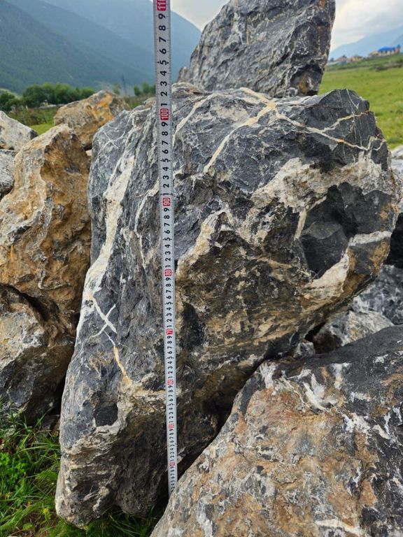 Чёрный мрамор обладает плотной структурой, устойчив к атмосферным воздействиям и сохраняет насыщенный цвет при намокании, создавая особенно яркий визуальный эффект. Каждый валун уникален по форме и рисунку прожилок.