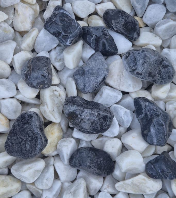 Чёрно-белая мраморная крошка галтовка — это декоративный материал, получаемый путём дробления и специальной обработки натурального мрамора (карбонатной породы). Галтовка (обработка в барабане с абразивом) придаёт частичкам гладкую, закруглённую форму без острых краёв, что делает её безопасной для использования в ландшафтном дизайне и строительстве. Цветовая гамма сочетает оттенки чёрного и белого (серо-белого), создавая контрастный, элегантный вид. Фракции обычно варьируются от 5-10 мм до 20-40 мм, что позволяет выбирать под конкретные нужды.