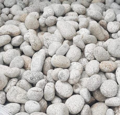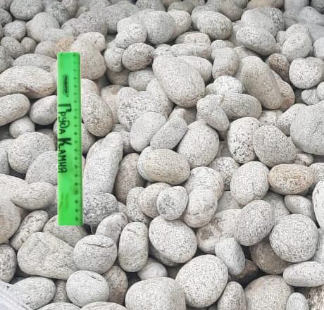 Крупная декоративная галька с гладкой округлой формой и необычным природным рисунком — белый фон с серыми и тёмными крапинками. Каждый камень уникален, благодаря чему композиции приобретают выразительность и стильный акцент.