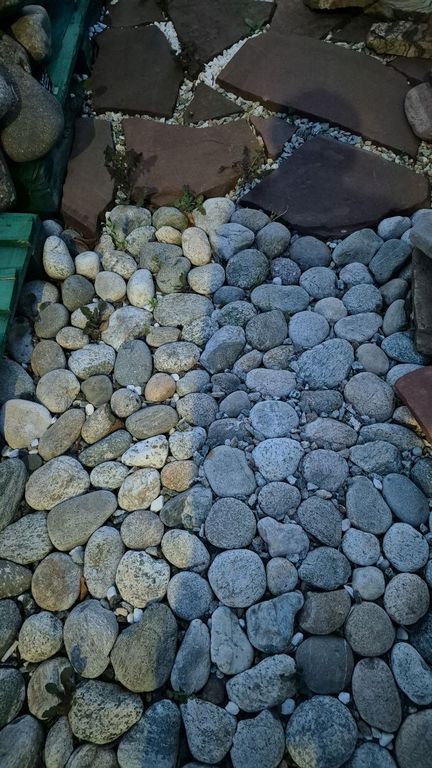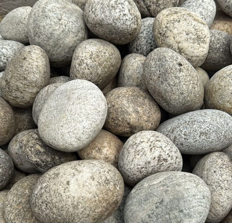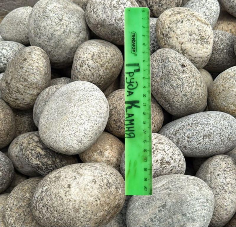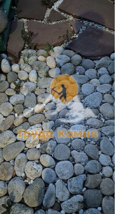 Натуральная галька средней фракции с плавными округлыми формами. Камни отличаются природной прочностью, естественной цветовой гаммой (от серых до тёплых оттенков) и гладкой поверхностью.