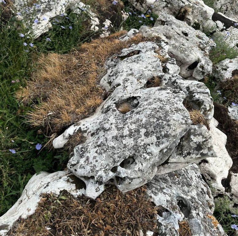 Его поверхность покрыта причудливыми впадинами и округлыми дырами, часто заполненными землёй и растущими в ней травами или мхами.