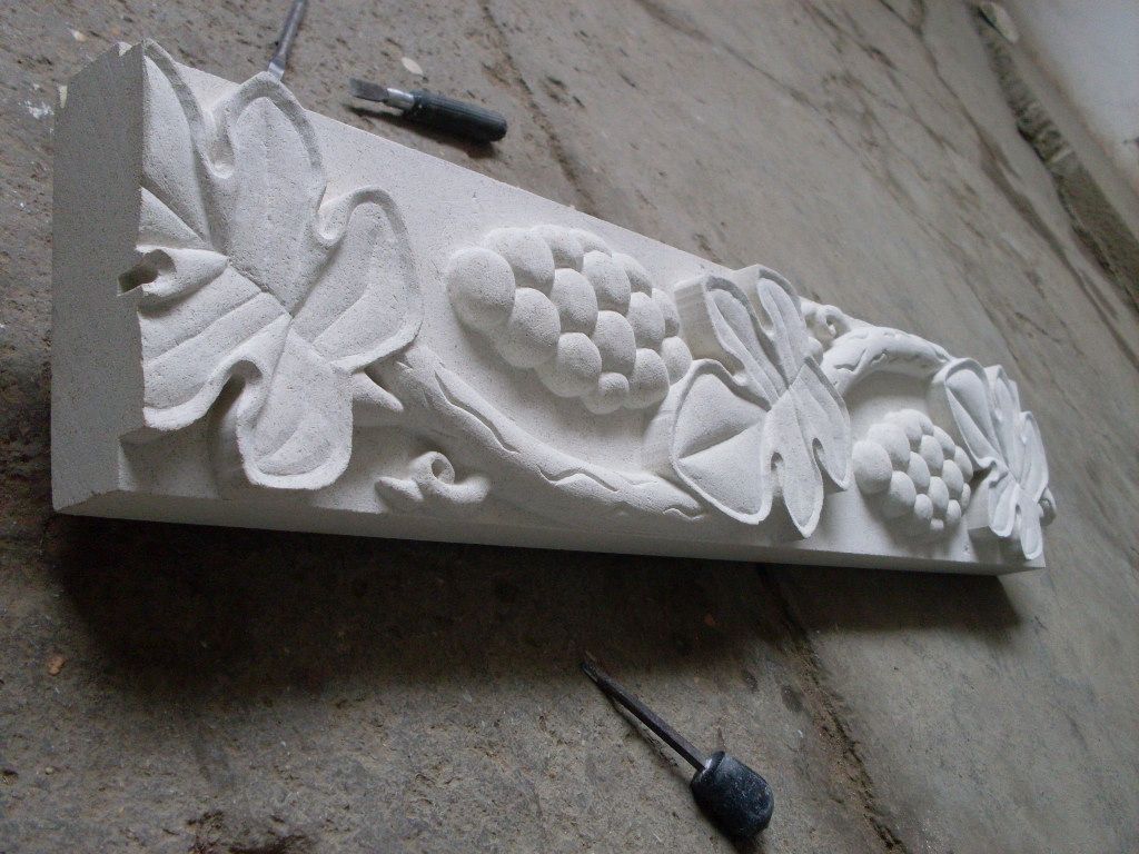 Наличник из натурального камня с узором "Виноград, лоза" — декоративный архитектурный элемент, выполненный из прочного природного камня с художественным рельефным орнаментом. Узоры придают наличнику элегантность и подчеркивают выразительность оконных и дверных проемов.