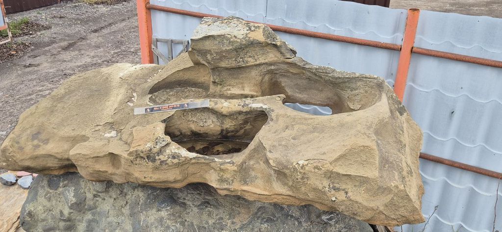Песчаник плоский с лицом внутри, очень прочный (вес 1700 кг) — уникальный природный камень массивного формата, подходящий для создания выразительных архитектурных и ландшафтных акцентов. Его характерная плоская форма с естественным «лицом» внутри придаёт камню особую декоративность, а высокая плотность и вес делают его идеальным для монументальных решений.