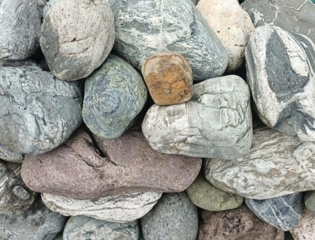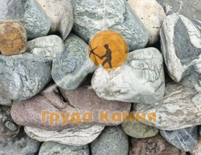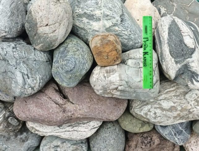 Крупная природная галька овальной и округлой формы. Отличается гладкой поверхностью и естественной палитрой оттенков — от светло-серого до тёмно-коричневого.