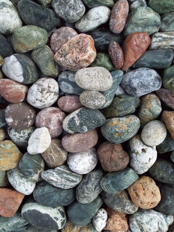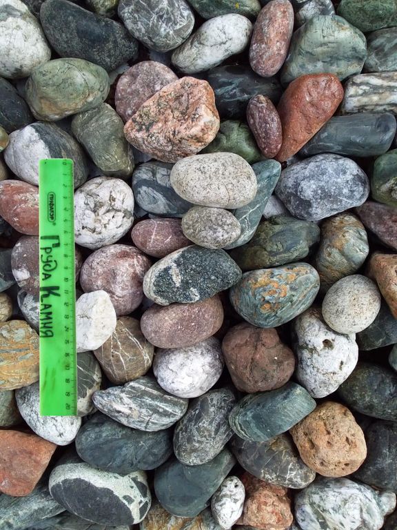 Крупная природная галька овальной и округлой формы. Отличается гладкой поверхностью и естественной палитрой оттенков — от светло-серого до тёмно-коричневого.